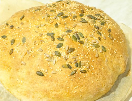 - პურის ზედაპირს გადაუსვით წყალი და მოაყარეთ თესლების ნაზავი (გოგრა, მზესუმზირა, ქუნჯუთი). ღუმელში შედგმულ ცეცხლგამძლე თასში ჩაასხით ცივი წყალი (ორთქლის შესაქმნელად). შედგით პური ღუმელში 15 წუთით. ამ დროს ღუმელის კარი არ გამოაღოთ, რომ ორთქლი არ გამოვიდეს.