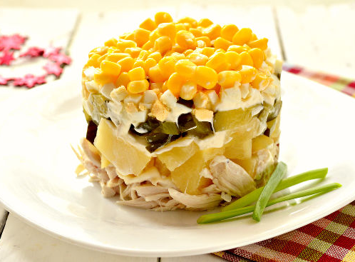 - ფრთხილად მოხსენით კულინარიული რგოლი. ფენოვანი სალათი ქათმით, ანანასითა და სიმინდით მზად არის! გემრიელად მიირთვით!