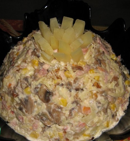 - შეაზავეთ მაიონეზით. მორთეთ სურვილისამებრ (მაგალითად, შეგიძლიათ გააკეთოთ ყვავილი ანანასის ნაჭრებისგან).