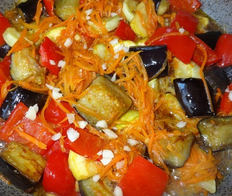 - დაამატეთ ბადრიჯანი, ყაბაყი, წიწაკა და დაქუცმაცებული ნიორი. ყველაფერი მიიყვანეთ ადუღებამდე. დააფარეთ ტაფას თავსახური, დაუწიეთ ცეცხლს და დატოვეთ მოსათუშად 2 წუთის განმავლობაში, რის შემდეგაც გამორთეთ ცეცხლი.