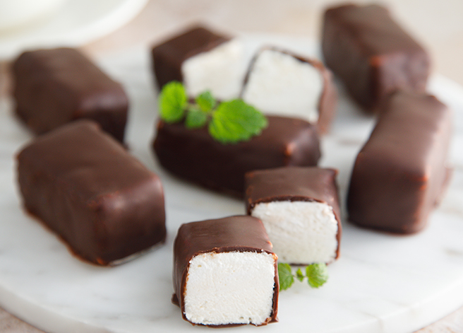 - ამოავლეთ სუფლეს ნაჭრები მინანქარში, დააწყვეთ სილიკონის ხალიჩაზე და აცალეთ გაშრობა (ეს ძალიან სწრაფად ხდება). თუ ნაჭრები საყინულეში გქონდათ, მიირთმევამდე 2 საათით მაცივარში გადაიტანეთ.